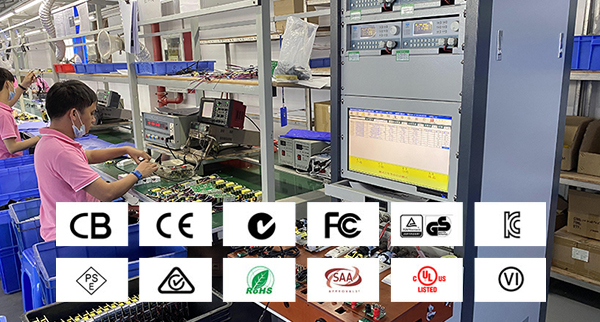 公司產品已通過多項國際和國內權威認證,包括:ISO9001質量管理體系認證;中國CCC認證;歐盟CB認證、CE認證GS認證、RoHS認證;美國FCC認證、ETL認證、UL認證(UL1310標準、UL60065標準、UL60950-1標準);日本PSE認證;韓國KC認證、KCC認證;印度BIS認證